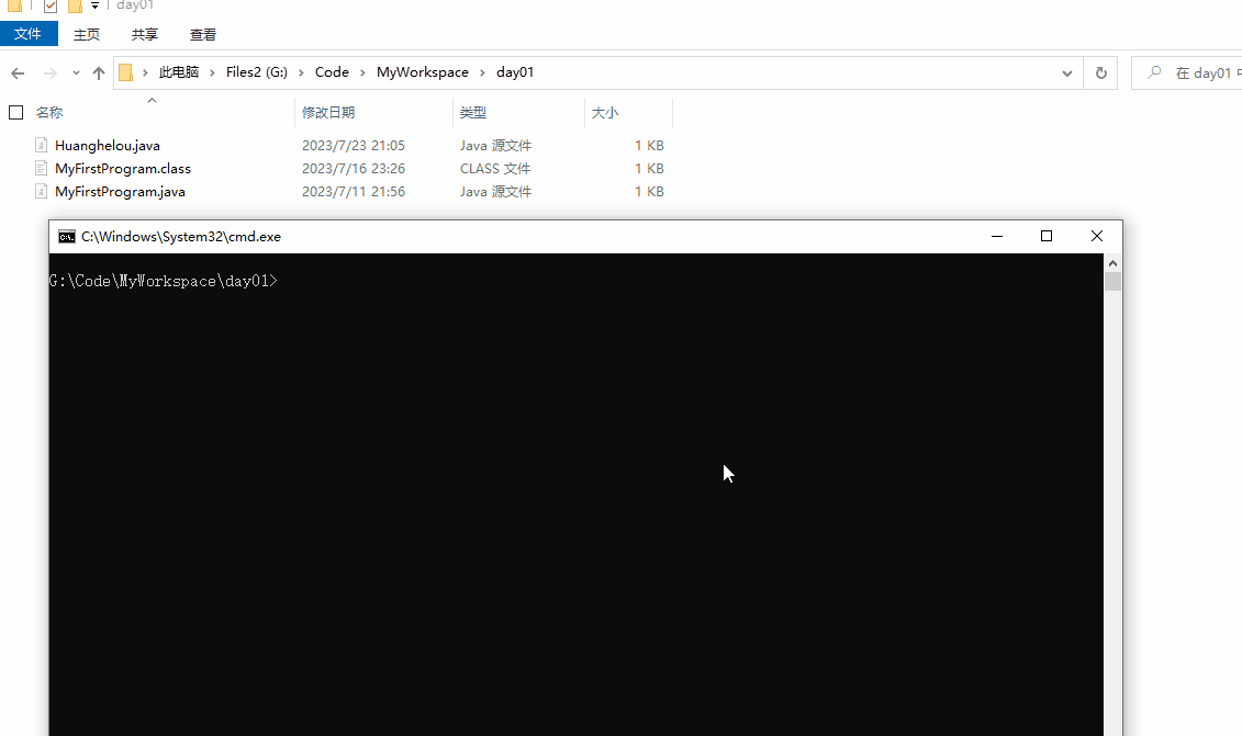 操作步骤如下图所示,上述命令执行完成后,此时文件夹中有一个MyFirstProgram.class文件,这个是Java编译器执行编译命令以后生成的二进制字节码文件(直接使用记事本打开是乱码文件):