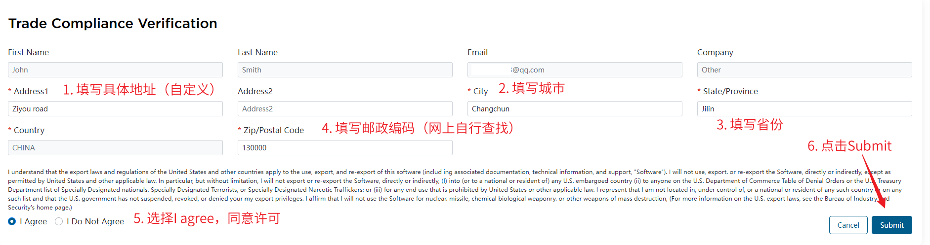 16. 按照下图提示填写表单信息,填写完成后点击右下角的Submit提交: